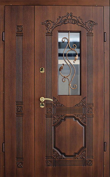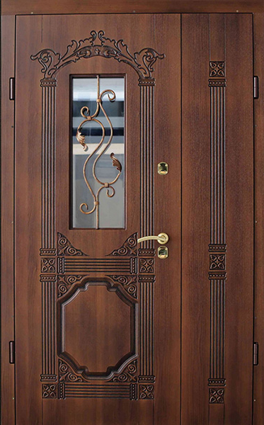 Уличная двухстворчатая дверь со стеклом и кованой решеткой №26 — это не только надежная защита для вашего дома, но и элемент, который подчеркнет его стиль и индивидуальность. Внешняя отделка из МДФ с ПВХ обеспечивает долговечность, устойчивость к внешним воздействиям и сохранение эстетического вида на долгое время. Добавление кованой решетки и стеклопакета придает двери элегантности, а также улучшает светопропускание, создавая комфортное освещение в вашем помещении. Уличная двухстворчатая дверь со стеклом и кованой решеткой №26 от производителя: быстрое изготовление и монтаж в Королеве, индивидуальные размеры, широкий выбор материалов и фурнитуры, официальная гарантия до 10 лет.