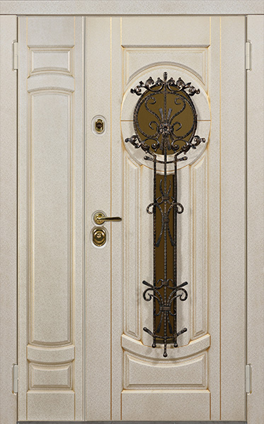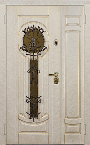 Двухстворчатая парадная дверь с ковкой и стеклом белая №30 — это сочетание красоты и надёжности. Конструкция из профильной трубы 50х25 мм и металлического листа толщиной 2 мм обеспечивает долговечность и стойкость к внешним воздействиям. Элементы ковки придают двери изысканный вид, а стеклопакет позволяет создать атмосферу лёгкости и прозрачности. Внешняя и внутренняя отделка выполнены из плиты МДФ, что делает дверь не только привлекательной, но и устойчивой к механическим повреждениям. Для дополнительной герметичности используются уплотнители с двумя контурами, а блокираторы обеспечат безопасность. Вариативность размеров и возможность добавления дополнительных опций, таких как шумо- и теплоизоляция, делают эту модель универсальной для установки в любом интерьере. Двухстворчатая парадная дверь с ковкой и стеклом белая №30 от производителя: быстрое изготовление и монтаж в Королеве, индивидуальные размеры, широкий выбор материалов и фурнитуры, официальная гарантия до 10 лет.